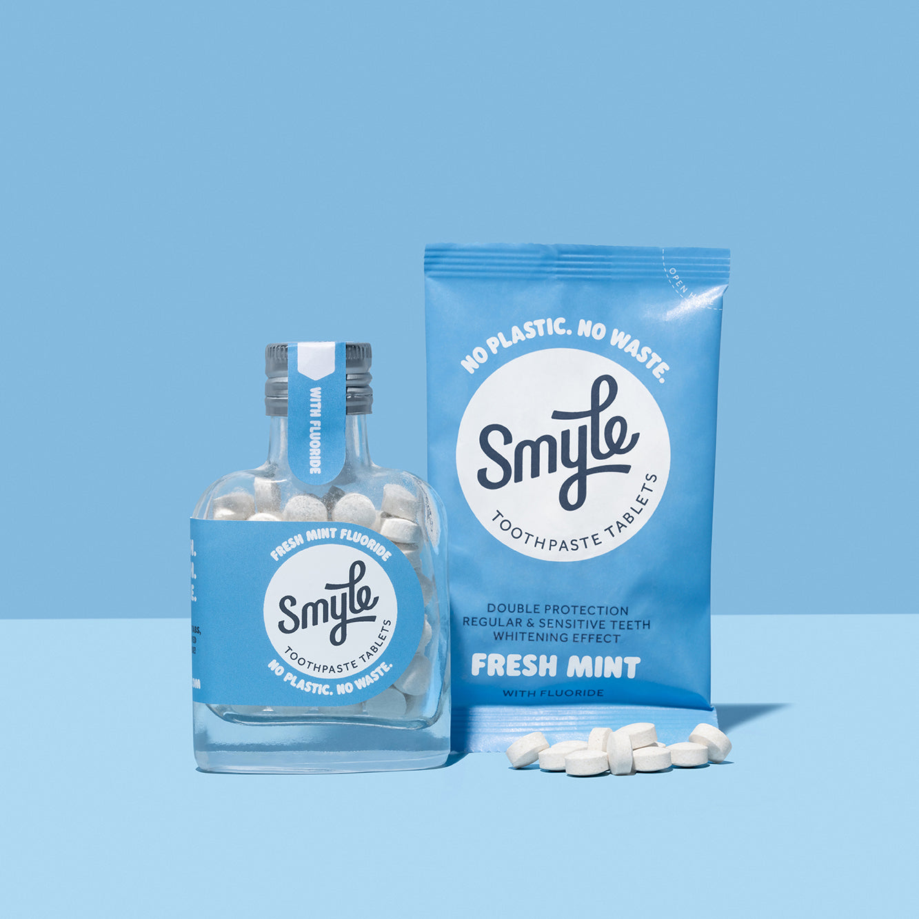 Vos nouvelles pastilles de dentifrice méritent une tenue de voyage, tout comme vous ne prenez pas le bus tout nu. Nos sachets recharge contiennent environ 63 pastilles. Ils sont fabriqués en papier compostable et recyclable jusqu’à 5 fois. Take that, tubes en plastique ! En plus, le papier est ultra léger, ce qui réduit les émissions de CO₂ lors du transport comparé au plastique.